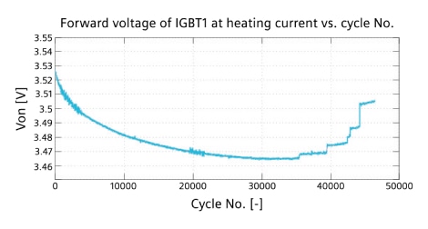 - IGBT1: Showed a decreasing voltage trend in the first 3,000 cycles due to a 5°C drop in average device temperature.